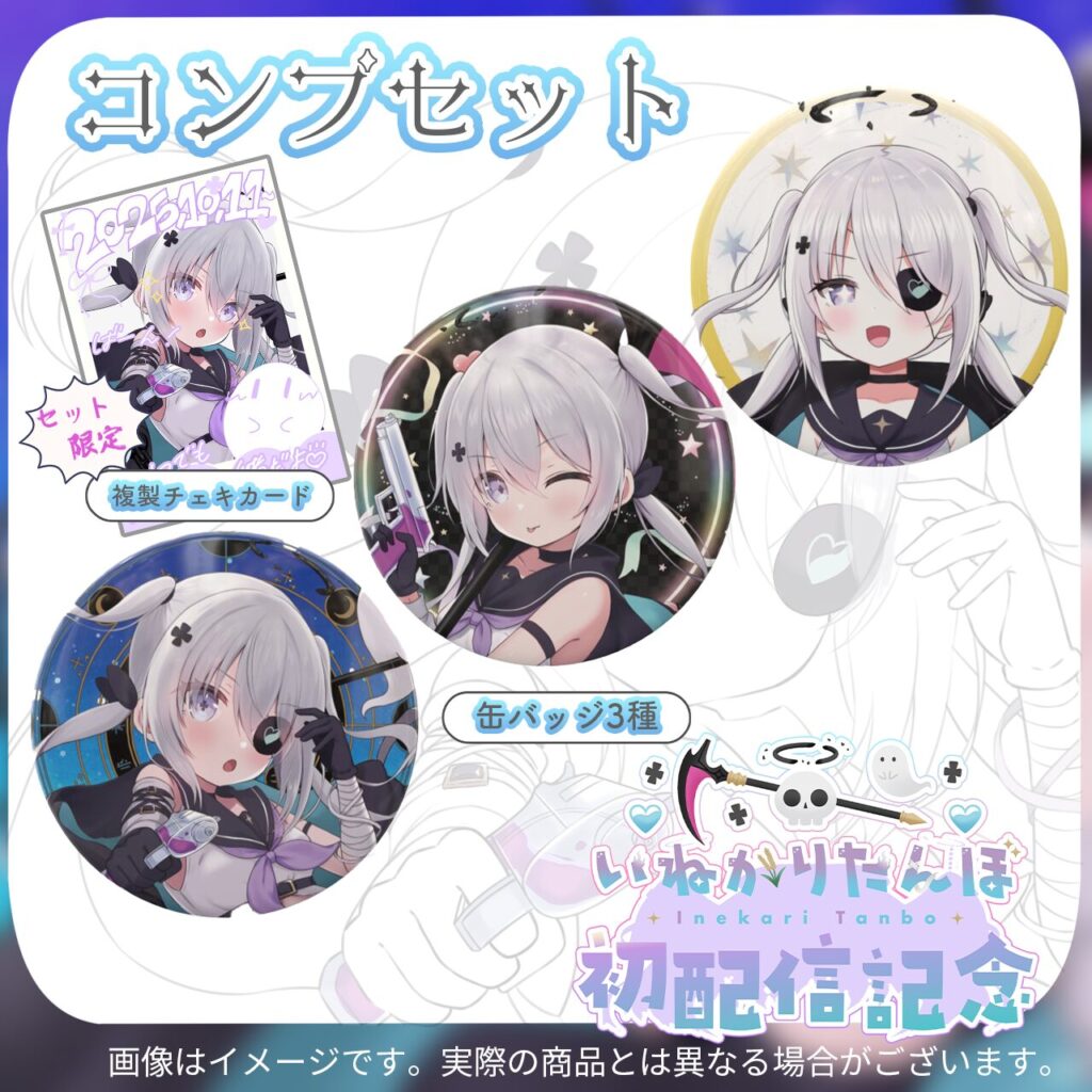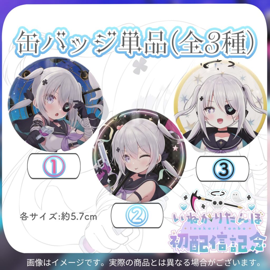 グッズラインナップは、缶バッジ全3種セット+特製チェキ風カード付き、缶バッジ単品全3種、システムボイス。